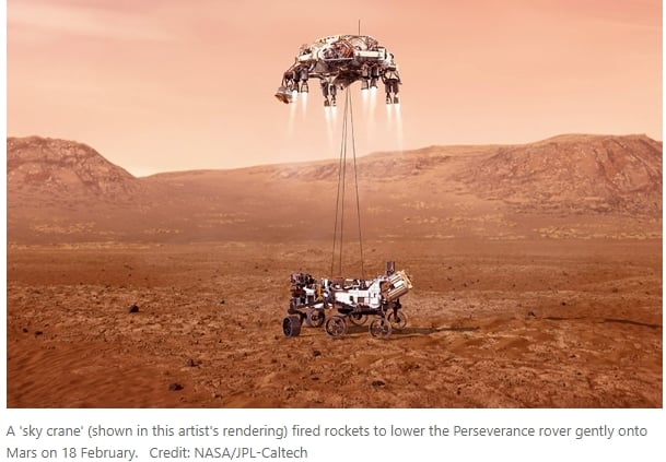 Finally, the landing vehicle is lowered to Mar's surface via cables.